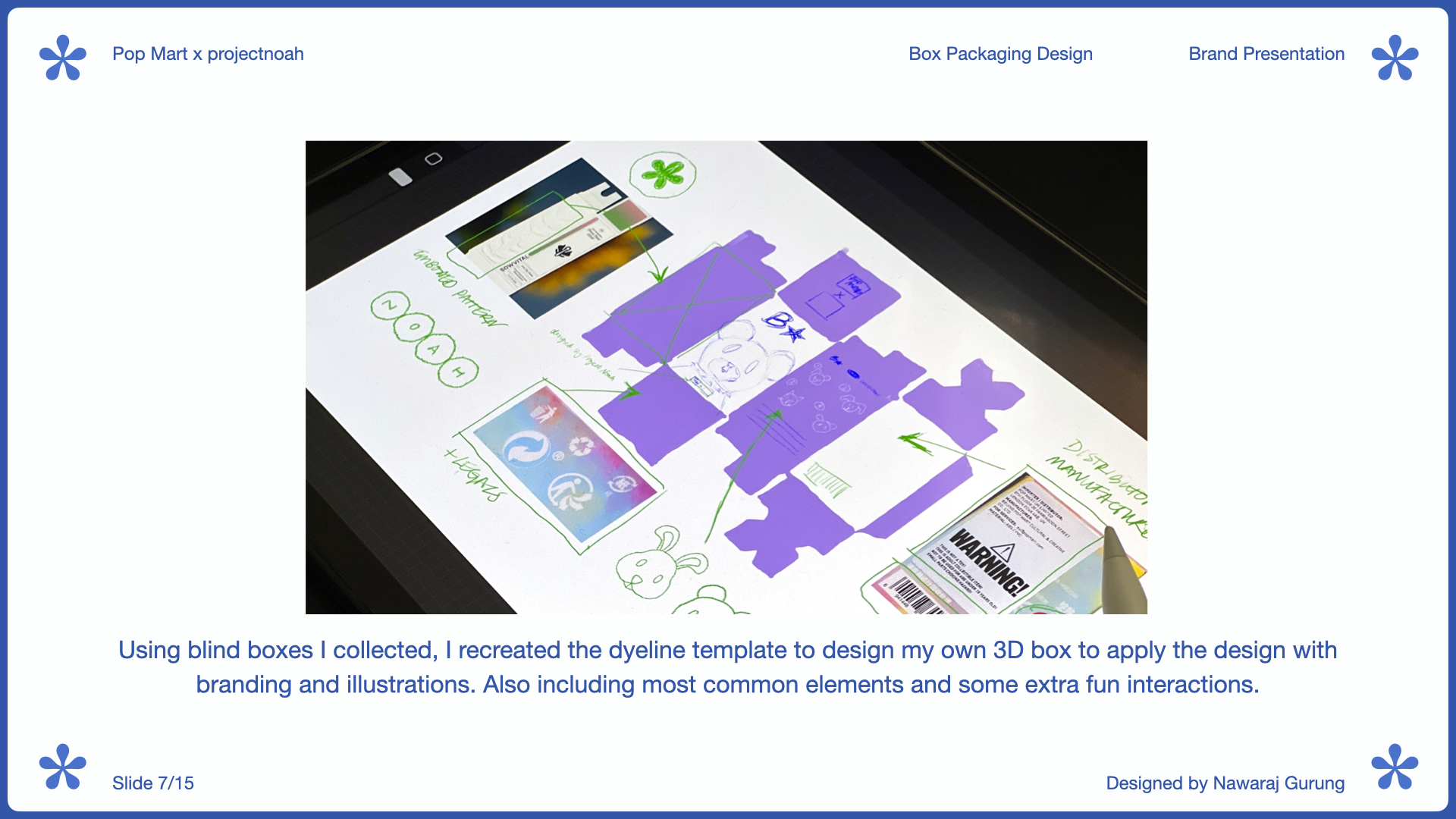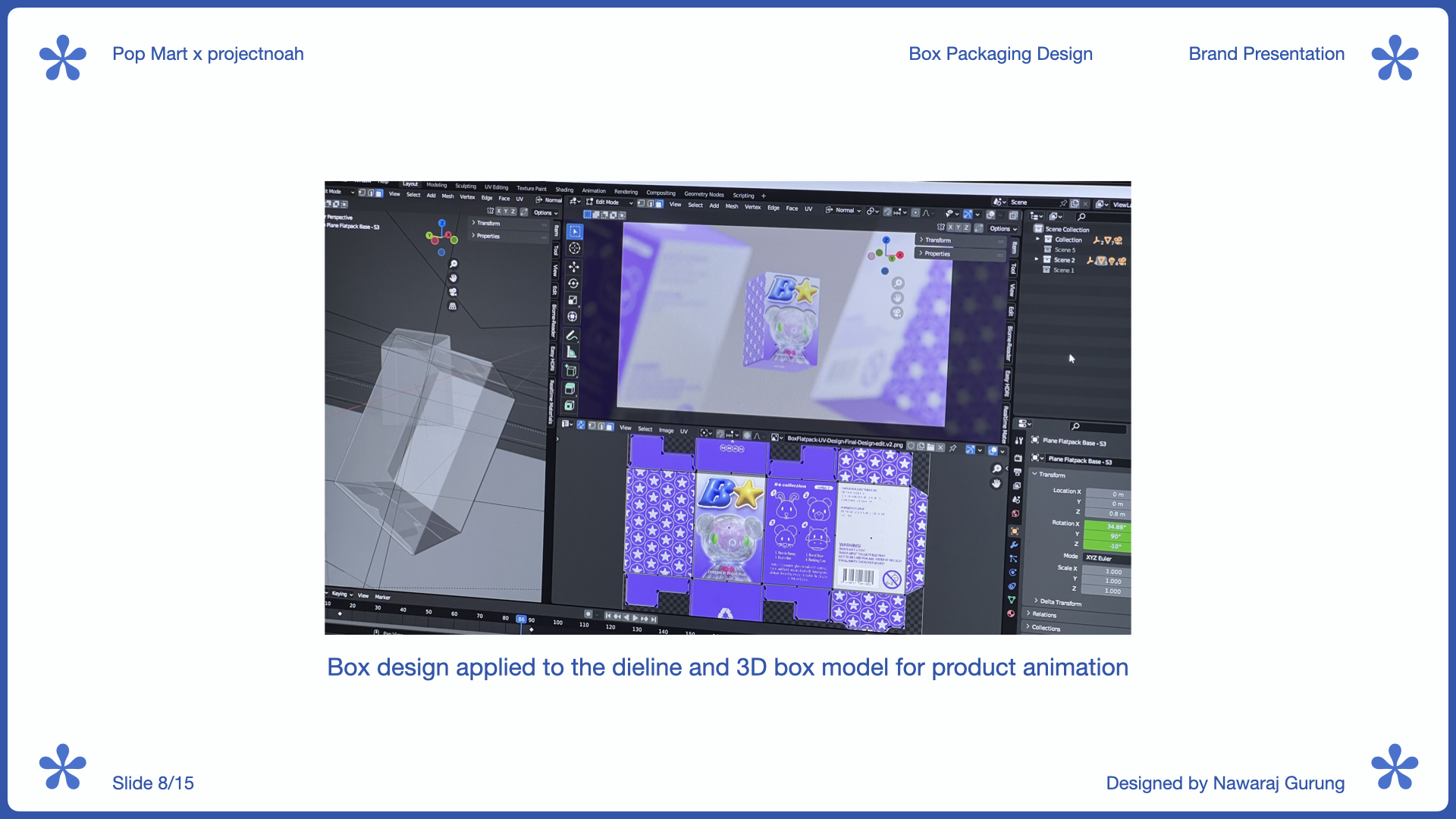 Using my own collected blind boxes as a base, I build a dieline in Adobe Illustrator from scratch which I used it to build the 3D box in Blender. Using that and the 3D product, I designed the packaging in Photoshop using patterns.