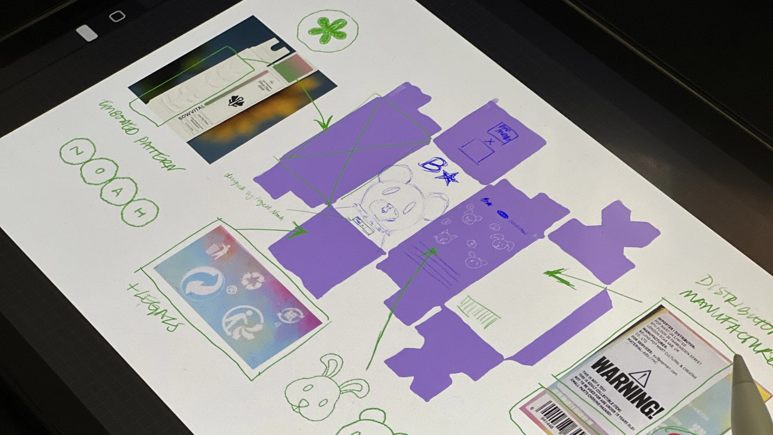 Purple gradient colours help to create a neutral airy and luxurious feel. Simple star patterns to relate to collection and fun element. Minimal bold text to add the retro nostalgia. An aesthetic and fun box with embossed elements in front and top for sensory element. Finishing it off by incorporating legal assets and labels.